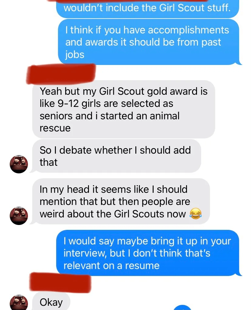 This phenomenon is not restricted to in person conversations, by the way. Most of the time, they are also gonna be exactly the same way via text, god forbid you have this type of person in a group chat. I’m sorry, but if I’m trying to open up to you about my most recent panic attack, and I mention really needing support, don’t immediately change the subject to the shit you’re dealing with! There is a time or place for that, and it is once my Valium kicks in. Or if the group chat is blowing up because Claire found out her boyfriend puts ketchup on a burrito, and she’s now wondering if it’s a break-up level offense (it is, by the way), that is in no way an invitation to start talking about whether or not to include Girl Scout accomplishments on a resume. Stick to the topic at hand, or slowly move it to what you want to talk about. Don’t give us virtual whiplash just because you’re pissed you’re not the center of group chat attention! Side-note: who the fuck would include Girl Scout accomplishments on a resume past the age of 18 let alone when you’re 29??