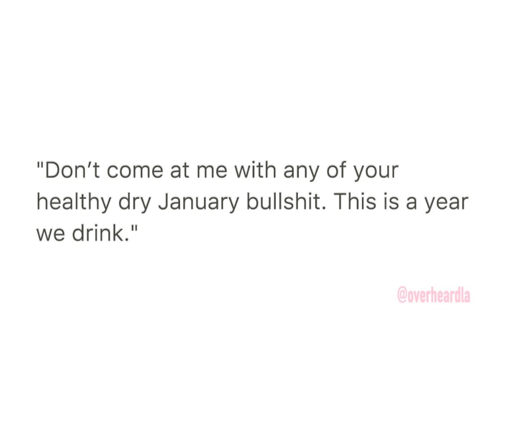I understand that any challenge attempted in January is extra hard because January is the longest and darkest month of the year. I don’t know how it just is. However, refraining from drinking shouldn’t be the Everest you’re making it out to be. You know what’s challenging? Refraining from dairy. Whether you’re lactose intolerant or not, it’s hard. Doing a thirty-day plank challenge is hard. Giving up caffeine is nearly superhuman, sociopathic, or both. My true Dry January would probably be detoxing from Bravo, which I might have to do anyway, but I’m weak.